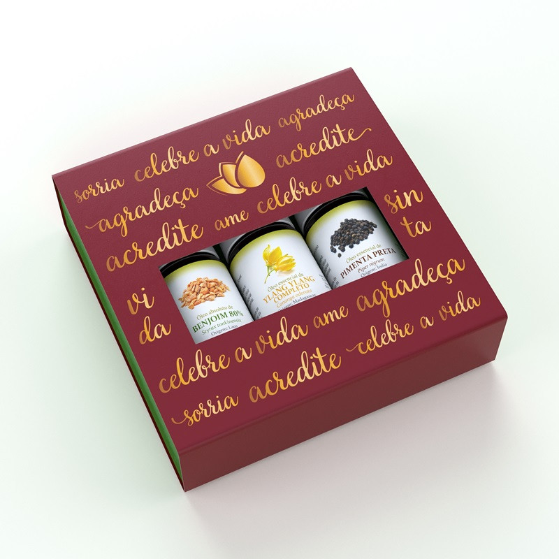 Kit com desconto! Acompanha linda caixa decorada para presentear quem você ama! 1un Óleo essencial de Lippia Alba 5ml 1un Óleo essencial de Mandarina Vermelha 10ml 1un Óleo essencial de Pimenta Rosa 10ml 1un Linda caixa decorada com palavras positivas