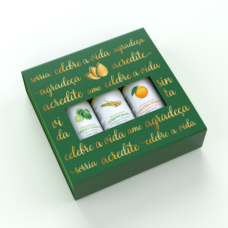 Kit com desconto! Acompanha linda caixa decorada para presentear quem você ama! 1un Óleo essencial de Lippia Alba 5ml 1un Óleo essencial de Mandarina Vermelha 10ml 1un Óleo essencial de Pimenta Rosa 10ml 1un Linda caixa decorada com palavras positivas