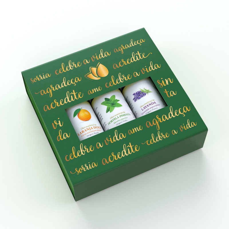 Kit com desconto! Acompanha linda caixa decorada para presentear quem você ama! 1un Óleo essencial de Eucalipto Globulus 10ml 1un Óleo essencial de Hortelã-Pimenta 10ml 1un Óleo essencial de Lavanda 10ml 1un Linda caixa decorada com palavras positivas