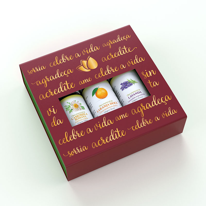 Kit com desconto! Acompanha linda caixa decorada para presentear quem você ama! 1un Óleo essencial de Eucalipto Globulus 10ml 1un Óleo essencial de Hortelã-Pimenta 10ml 1un Óleo essencial de Lavanda 10ml 1un Linda caixa decorada com palavras positivas