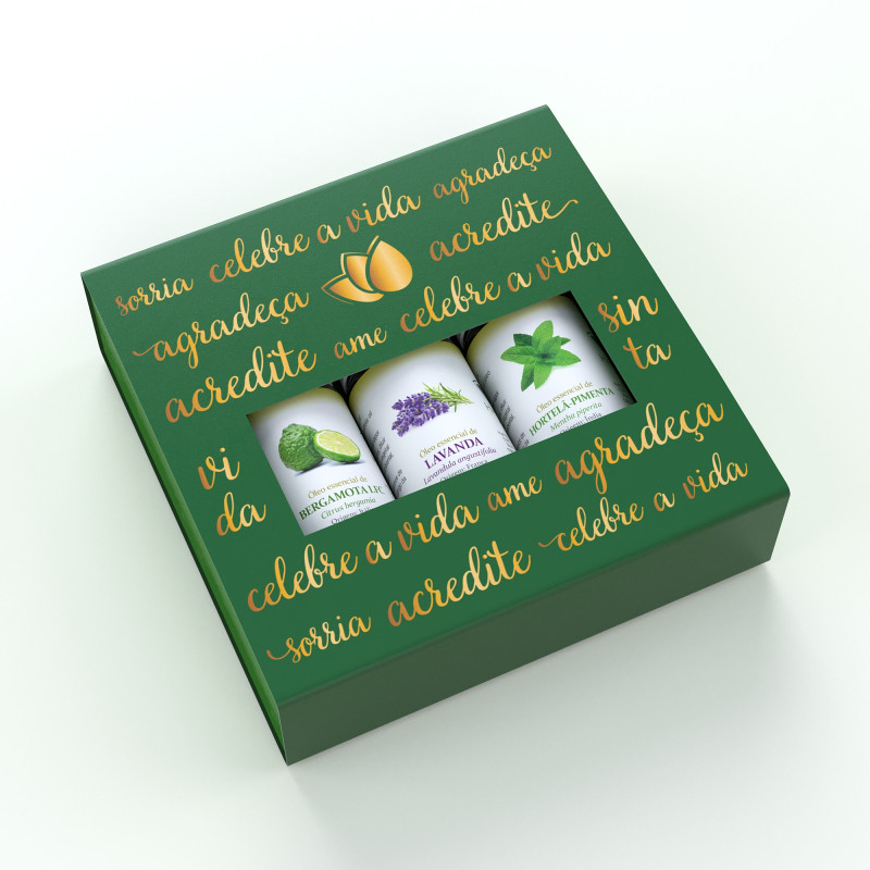 Kit com desconto! Acompanha linda caixa decorada para presentear quem você ama! 1un Óleo essencial de Eucalipto Globulus 10ml 1un Óleo essencial de Hortelã-Pimenta 10ml 1un Óleo essencial de Lavanda 10ml 1un Linda caixa decorada com palavras positivas