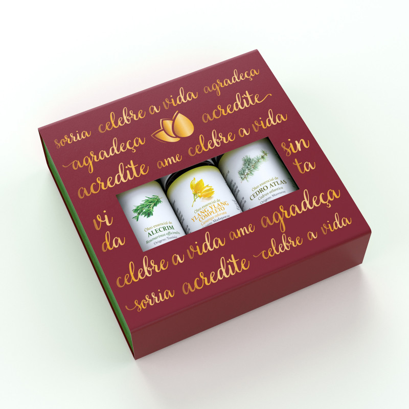 Kit com desconto! Acompanha linda caixa decorada para presentear quem você ama! 1un Óleo essencial de Lippia Alba 5ml 1un Óleo essencial de Mandarina Vermelha 10ml 1un Óleo essencial de Pimenta Rosa 10ml 1un Linda caixa decorada com palavras positivas