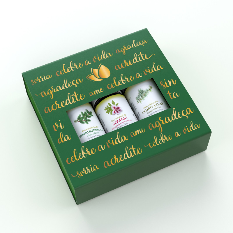 Kit com desconto! Acompanha linda caixa decorada para presentear quem você ama! 1un Óleo essencial de Eucalipto Globulus 10ml 1un Óleo essencial de Hortelã-Pimenta 10ml 1un Óleo essencial de Lavanda 10ml 1un Linda caixa decorada com palavras positivas