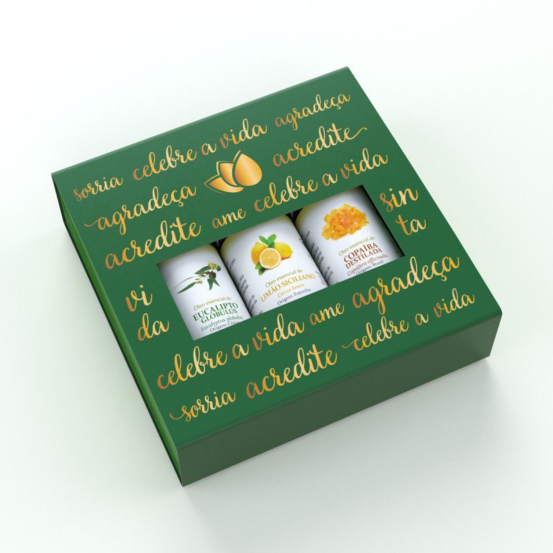 Kit com desconto! Acompanha linda caixa decorada para presentear quem você ama! 1un Óleo essencial de Copaíba Destilada 10ml 1un Óleo essencial de Limão Tahiti 10ml 1un Óleo essencial de Vetiver 5ml 1un Linda caixa decorada com palavras positivas