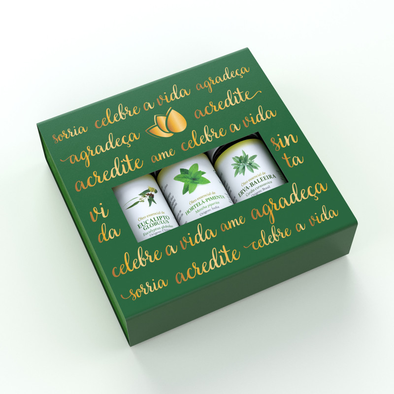 Kit com desconto! Acompanha linda caixa decorada para presentear quem você ama! 1un Óleo essencial de Eucalipto Globulus 10ml 1un Óleo essencial de Hortelã-Pimenta 10ml 1un Óleo essencial de Lavanda 10ml 1un Linda caixa decorada com palavras positivas