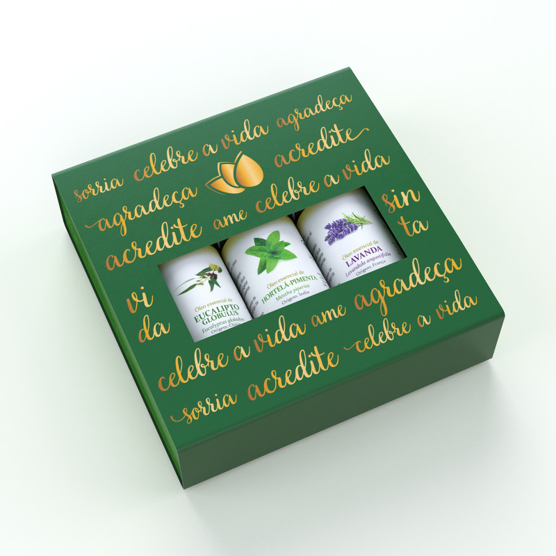 Kit com desconto! Acompanha linda caixa decorada para presentear quem você ama! 1un Óleo essencial de Erva-Baleeira 5ml 1un Óleo essencial de Eucalipto Globulus 10ml 1un Óleo essencial de Hortelã-Pimenta 10ml 1un Linda caixa decorada com palavras positivas